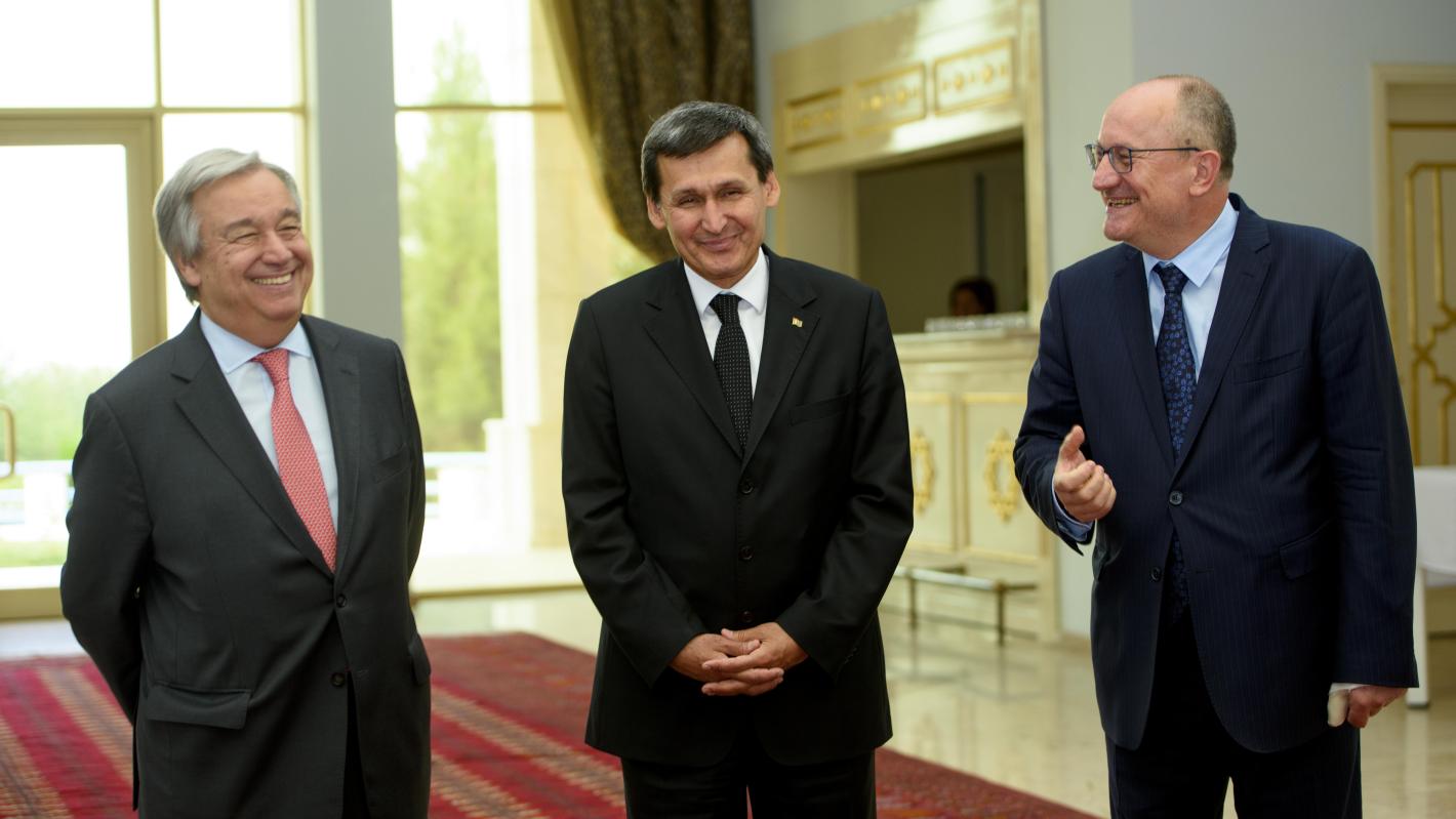 United Nations Secretary-General Mr. Antonio Guterres, Deputy Chairman of the Cabinet of Ministers and Minister of Foreign Affairs of Turkmenistan Mr. Rashid Meredov and SRSG Draganov delivering opening speech.