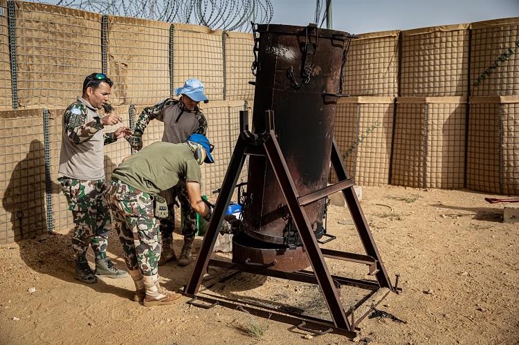 To address this challenge, the United Nations Mine Action Service (UNMAS), in cooperation with the Nepalese contingent in Kidal, began destroying small caliber ammunition on 8 September, following a strict protocol. After careful sorting, the ammunition is grouped by category and subjected to an incineration process. A sophisticated incineration mechanism has been set up by the team to ensure that each munition is completely neutralized in complete safety.
