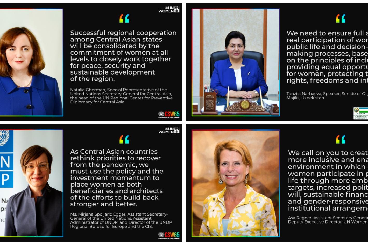29 June 2021 Women Leaders' Caucus Statement of the Central Asia Women Leaders' Caucus at the round table “The role of global and regional platforms and coalitions in enhancing women’s participation and leadership in conflict prevention and peacebuilding” We, the representatives of the Republic of Kazakhstan, the Kyrgyz Republic, the Republic of Tajikistan, Turkmenistan and the Republic of Uzbekistan, with the support of the UN, have created the first Women Leaders Caucus in…