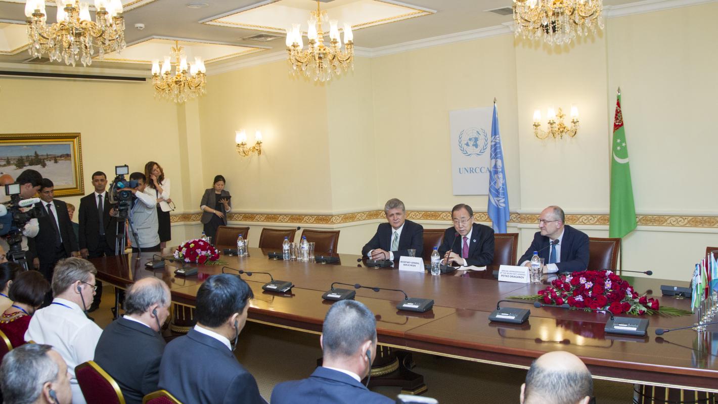 Throughout my visit I have heard again and again strong support for the essential work of the United Nations Regional Centre for Preventive Diplomacy for Central Asia. And I want to thank again the Government of Turkmenistan for its solid support, and I would also like to thank, first of all, Mr. [Miroslav] Jenca, who had been here for seven years as head of this Centre. Now I would like to proudly present to you again, even though you might have met him, Mr. [Petko] Draganov, who is very experienced, with long experience in the UN system, now taking over this very important job. I really count on your strong support in working with him.